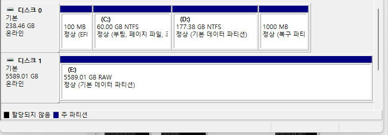 - 6TB HDD 2개 모두 RAW 파티션으로 변경되어 액세스가 안됨.
