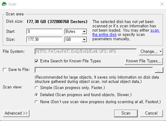 Scan 버튼을 누르면 Scan 과정이 진행됩니다. - 용량이 6TB가 아닌 이유는 복구 당시 경황이 없어 캡쳐본이 없어 현재 예시로 캡쳐한 것이기 때문입니다.