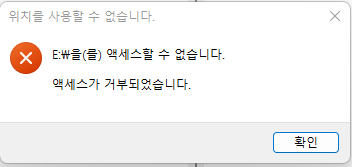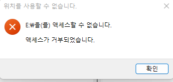 탐색기에서 E 드라이브를 접근하니 아래와 같이 액세스가 거부되었습니다. 라는 팝업과 합께 접근이 안됩니다.