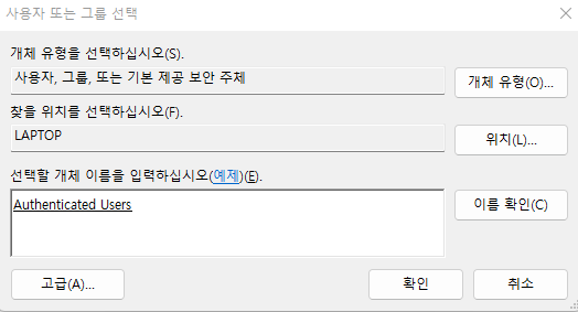 아래와 같이 밑줄친 형태로 Autherticated Users가 확인이 됩니다. 확인 버튼을 누릅니다.