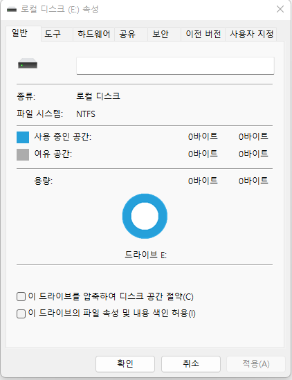 탐색기로 E 드라이브 속성을 확인하니 NTFS로 변경되었으나 용량이 0바이트로 확인됩니다.