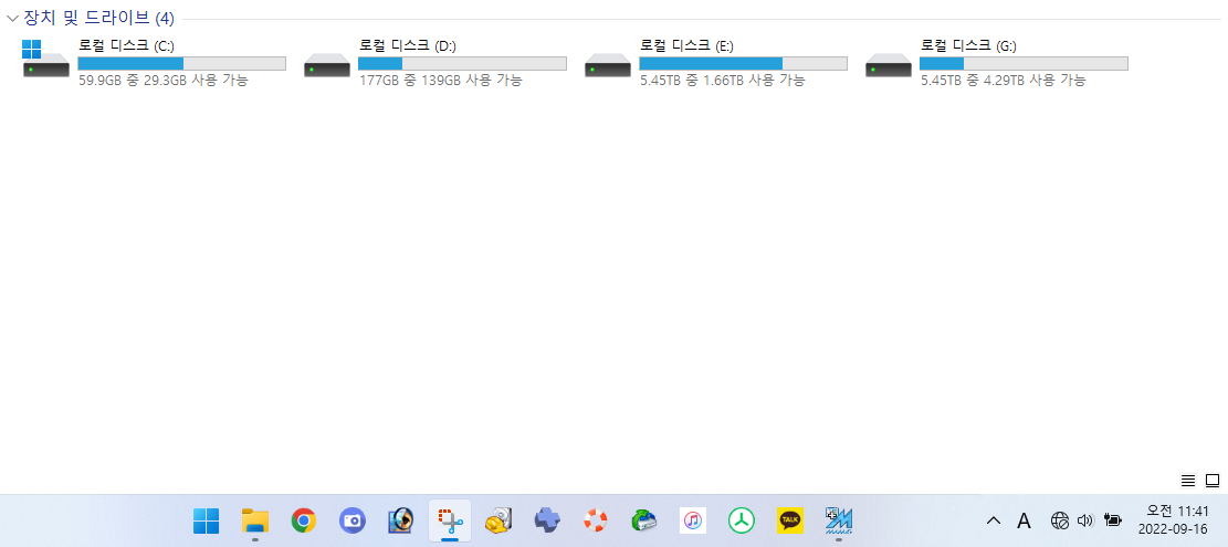 RAW 파티션으로 변경경된 6TB 하나를 chkdsk 명령으로 복구해서 탐색기로 보여지는 파일만 확인 및 다른 HDD로 복사했고, FOUND.000 폴더는 아직 확인 안한 상황입니다. 아래와 같이 복구된 HDD인 E 드라이브는 1.66TB 용량이 남았지만, E 드라이브 파일을 복사한 G 드라이브는 4.29TB 남은 것으로 보아 대부분 복구 과정에서 FOUND.000 숨김 폴더로 복구된 것을 며칠 뒤에 확인했습니다.