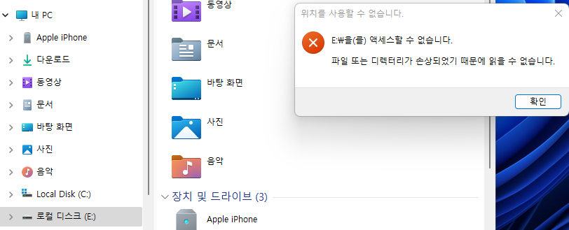 파일 또는 디렉터리가 손상되었기 떄문에 읽을 수 없습니다. 라는 팝업이 뜨면서 접근이 안됩니다.