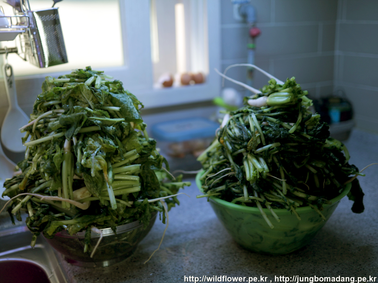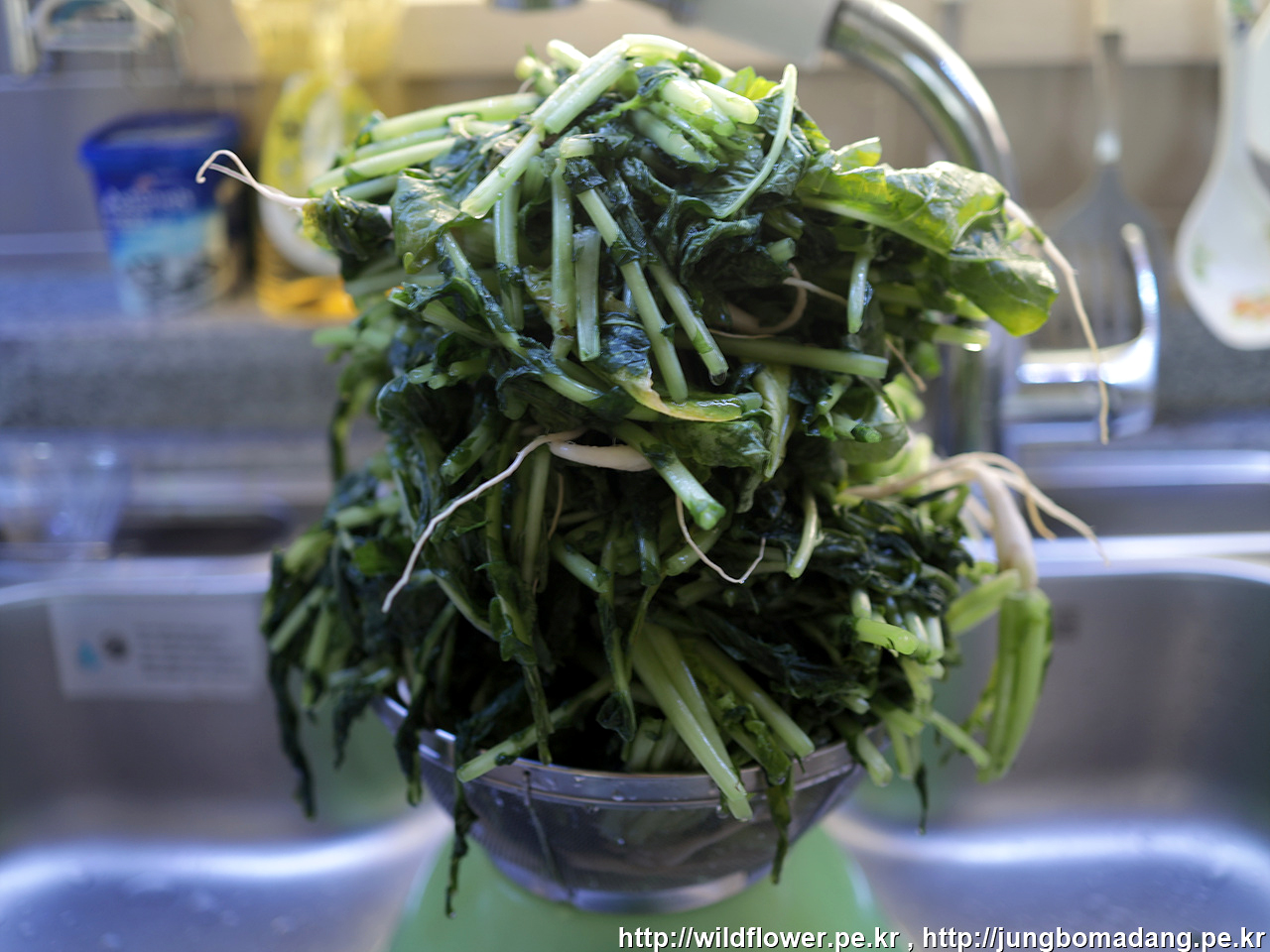 3. 2.번 절인 열무를 흐르는 물에 2~3회 씻는다. 이 과정에서 열무에 있는 흙까지 세척이 됨. 본인은 2번 세척합니다. 세척한 것은 물을 뺀다. 이때 열무에 물기를 손으로 짜면 안됨. 본인은 1. 번 과정의 그릇이 작아서 3단 먼저 절이고, 물기를 빼면서 바로 나머지 2단도 절이는 과정을 진행해서, 30분~1시간 정도 물을 뺐습니다.