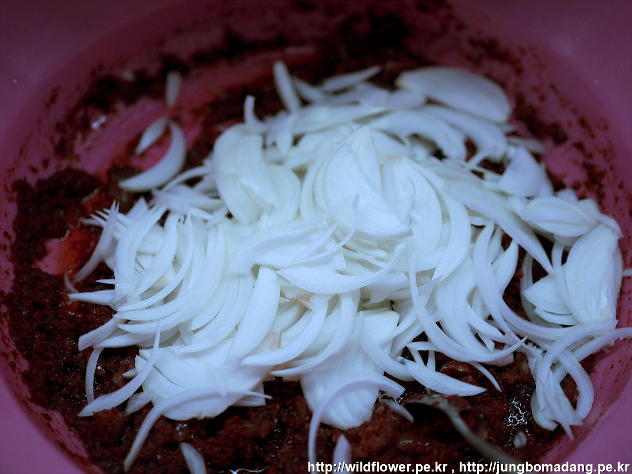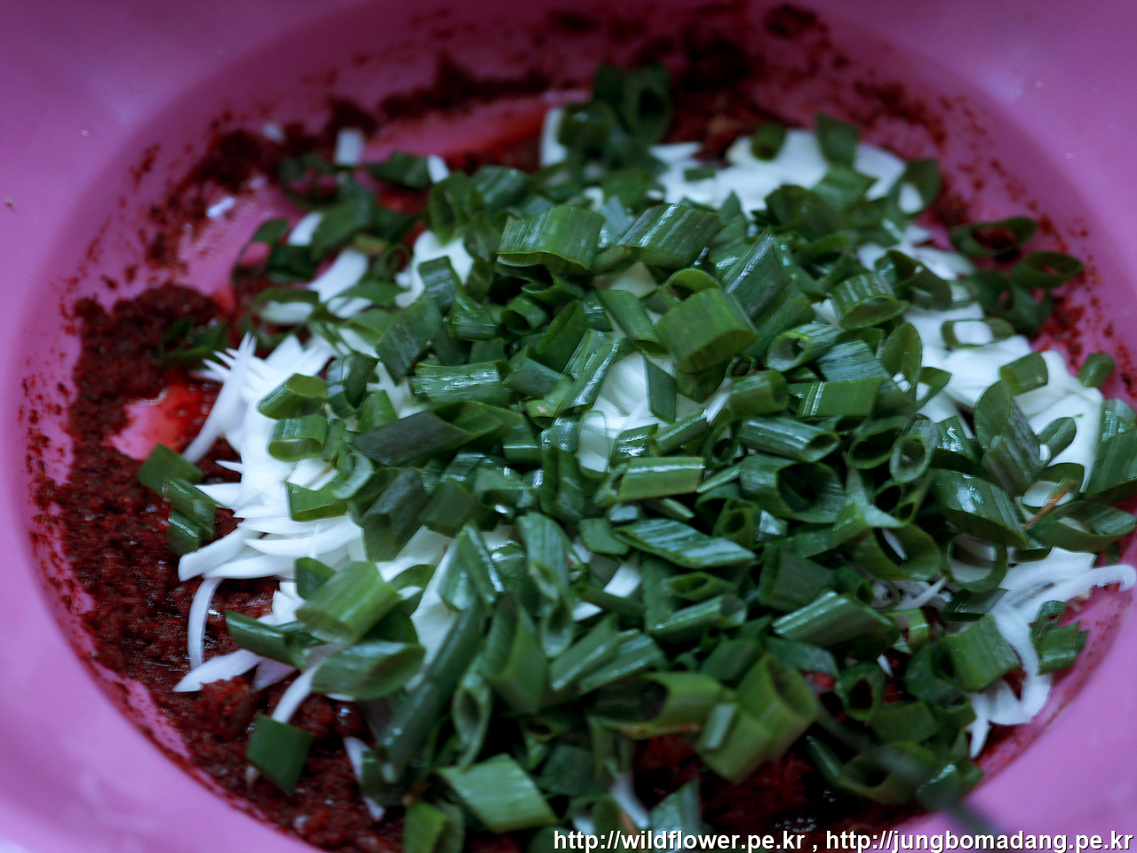 4. 멸치액젓, 설탕, 고춧가루를 섞은 뒤, 그 뒤에 양마, 대파, 열무 넣고 뒤적 뒤적합니다. 근데 너무 오래 뒤적이면 안된다고 하네요. 양념이 열무에 적당히 버무려질 정도만.