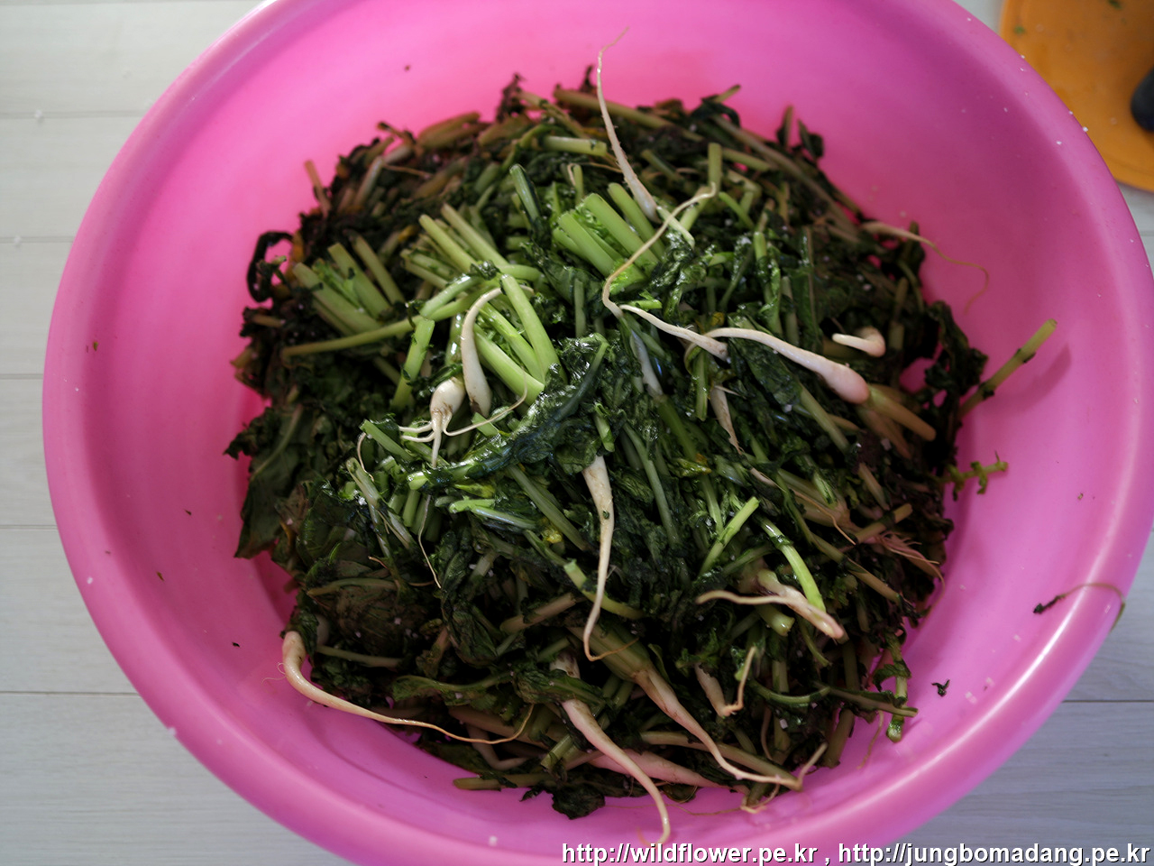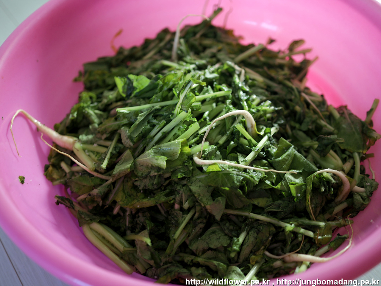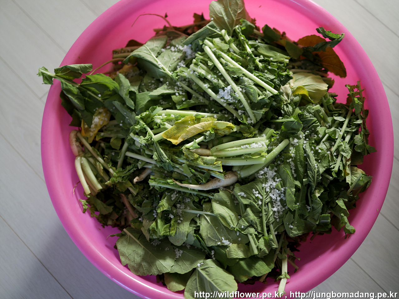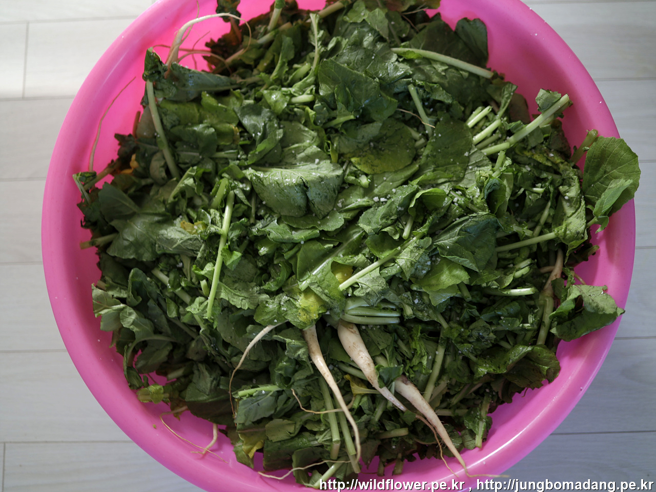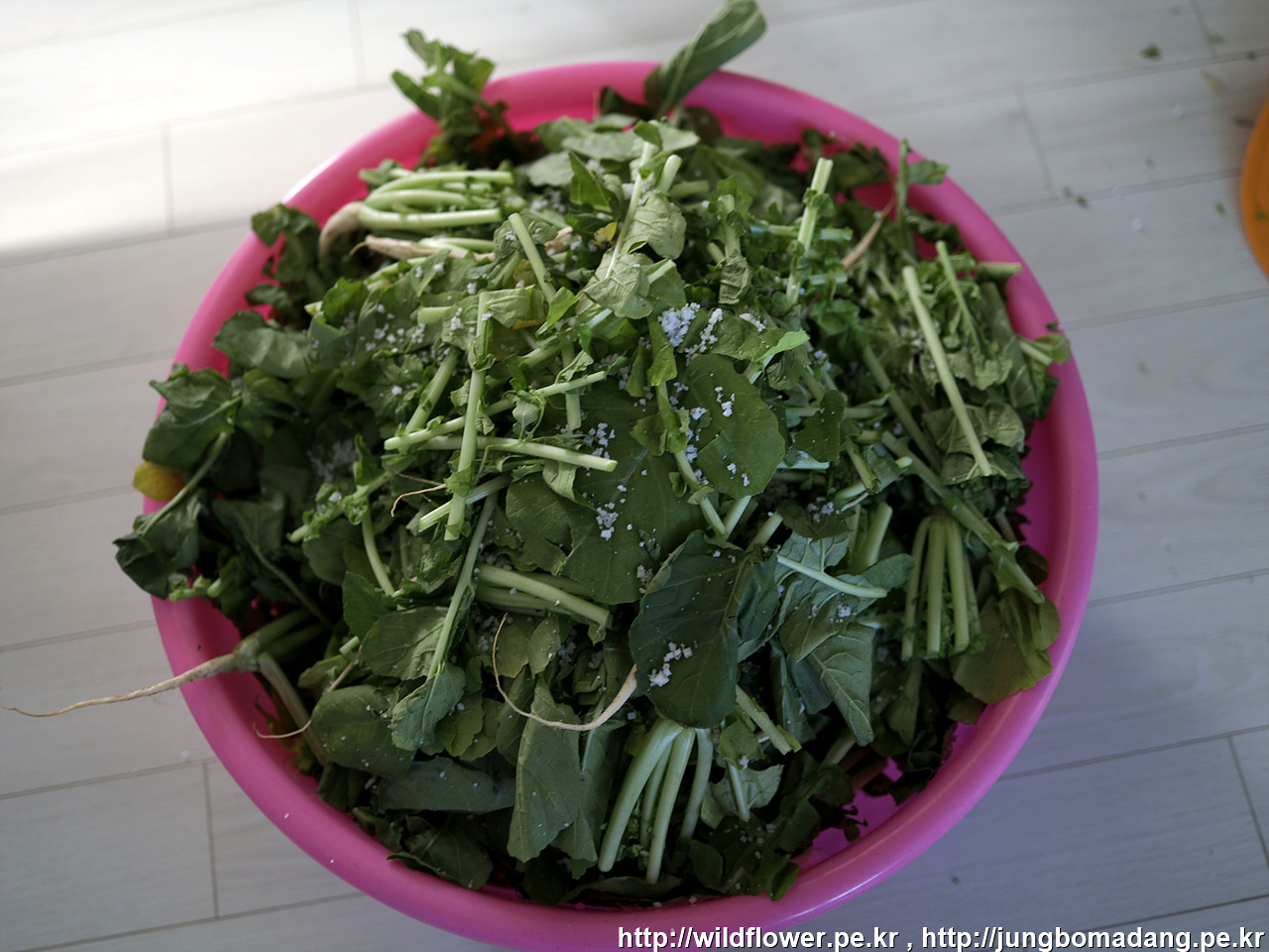 열무 5단 중에 3단을 잘라서 그릇에 굵은 소금 뿌리면서 넣었습니다. 열무 원산지는 포천이네요.