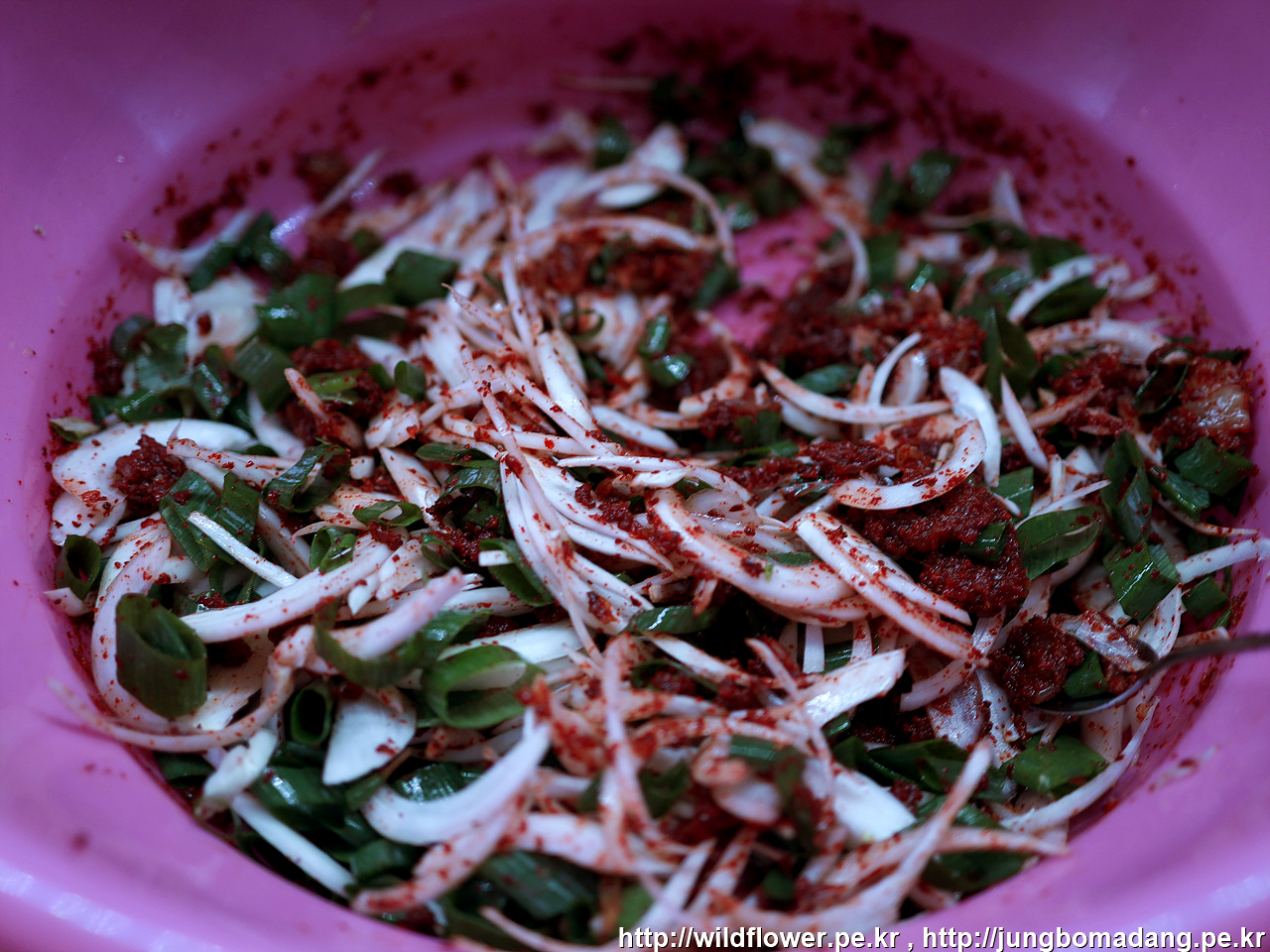 4. 멸치액젓, 설탕, 고춧가루를 섞은 뒤, 그 뒤에 양마, 대파, 열무 넣고 뒤적 뒤적합니다. 근데 너무 오래 뒤적이면 안된다고 하네요. 양념이 열무에 적당히 버무려질 정도만.