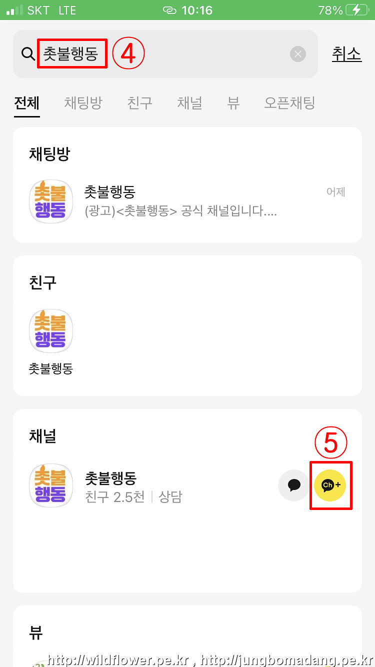 촛불행동 입력(④) 하시고, 채널 추가(⑤) 터치하시면 됩니다.