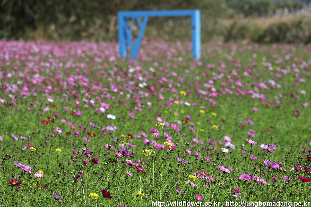 파란색 포토 스팟 주변으로는 보다 많은 코스모스가 피어 있습니다.