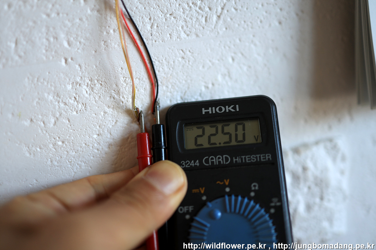전압을 측정해 보니 22.5V가 나오네요. 작업시 보일러쪽에 연결된 전원 코드를 빼고 작업할 것을 권장합니다.
