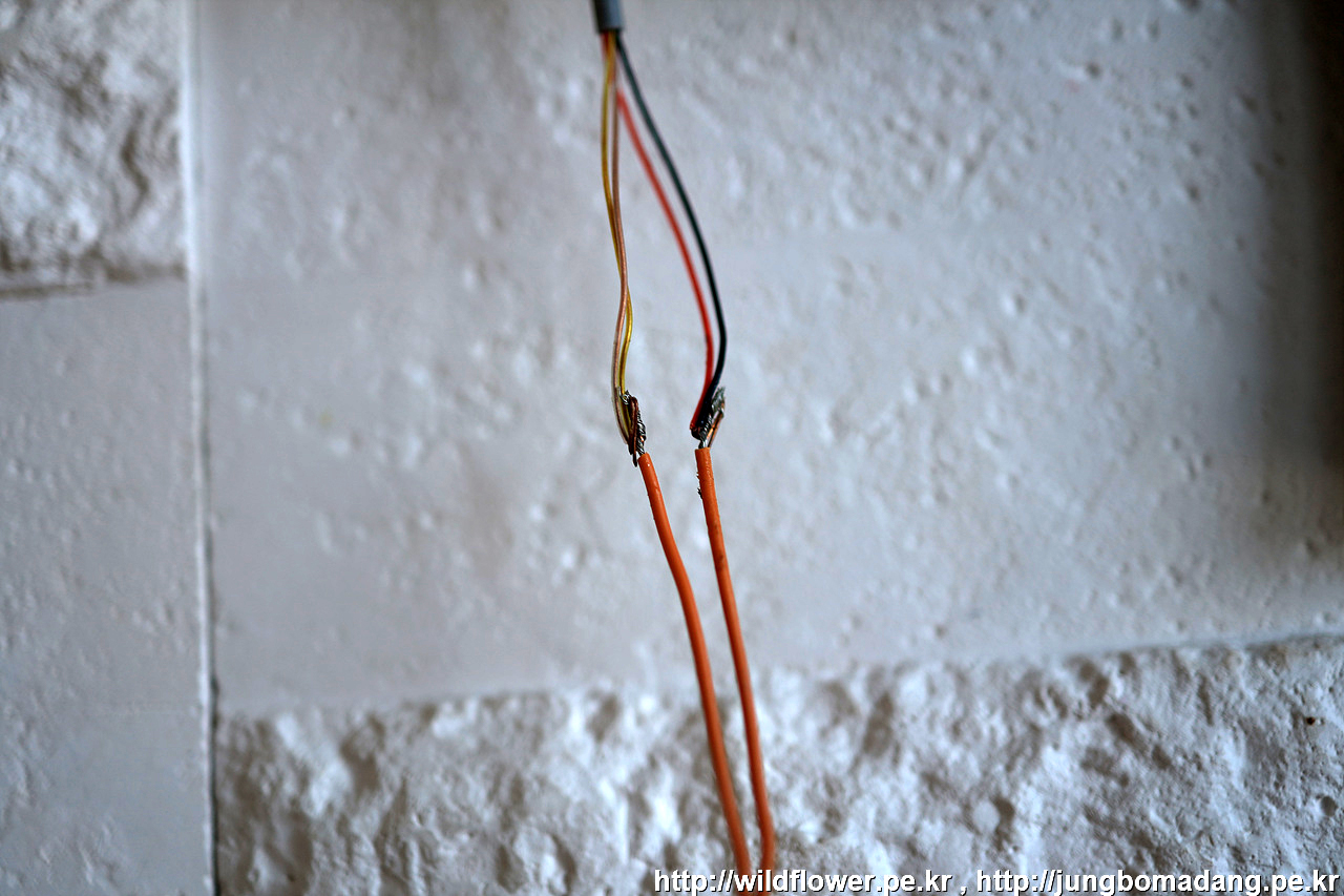 일단, 기존에 온도조절기에 전기 테이프를 벗겨 내면 아래쪽이 온도조절기 부분이고, 윗쪽이 보일러측에 연결된 부분입니다. 검정색과 적색선이 함께 그리고 나머지 두 선이 함께 묶여서 아래 온도 조절기 선과 연결되어 있죠.