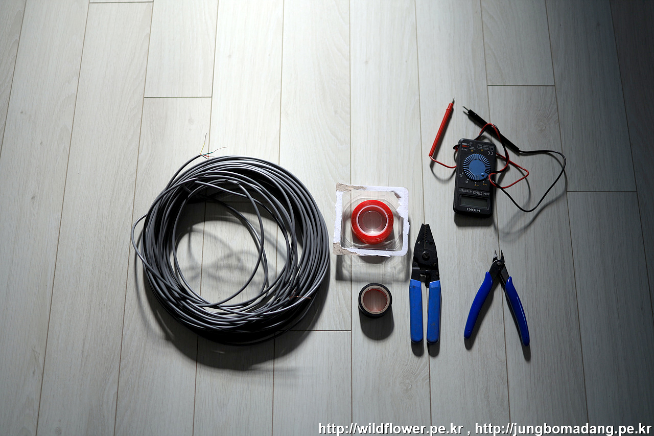 우선 필요한 재료를 봅니다. 다행히 예전에 작업 떄문에 사둔 인터폰선(2P) 20M가 있었고, 그 외에 보일러에서 나오는 배선 전압 및 + - 를 확인하기 위해 테스터기, 온도조절기를 부착할 실리콘 양면테이프, 전선 커터기, 니퍼 등이 보이네요.
