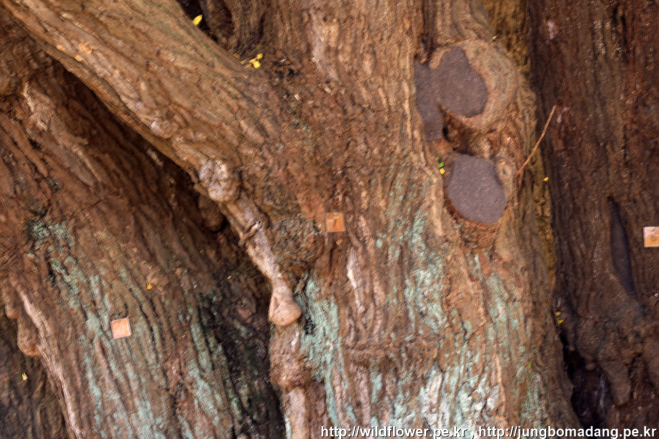 나무에 숫자가 새겨져 있는 데, 줄기가 7개로 이뤄진 것을 알 수 있습니다. 수령은 약 850년입니다.