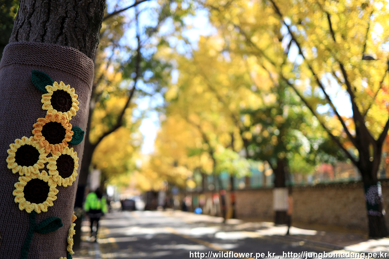 나무 줄기를 감싼 실뜨개가 따뜻하게 느껴집니다.