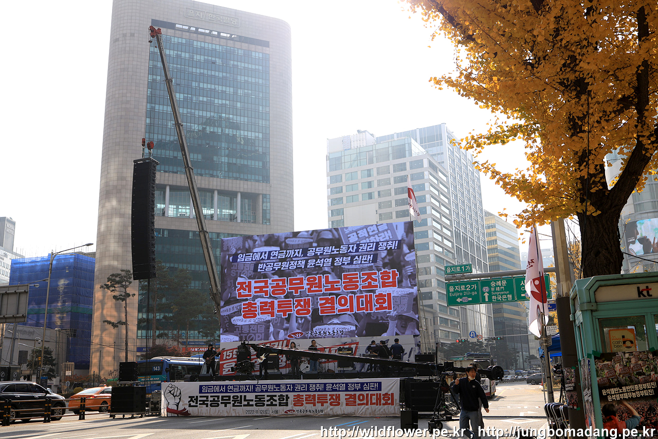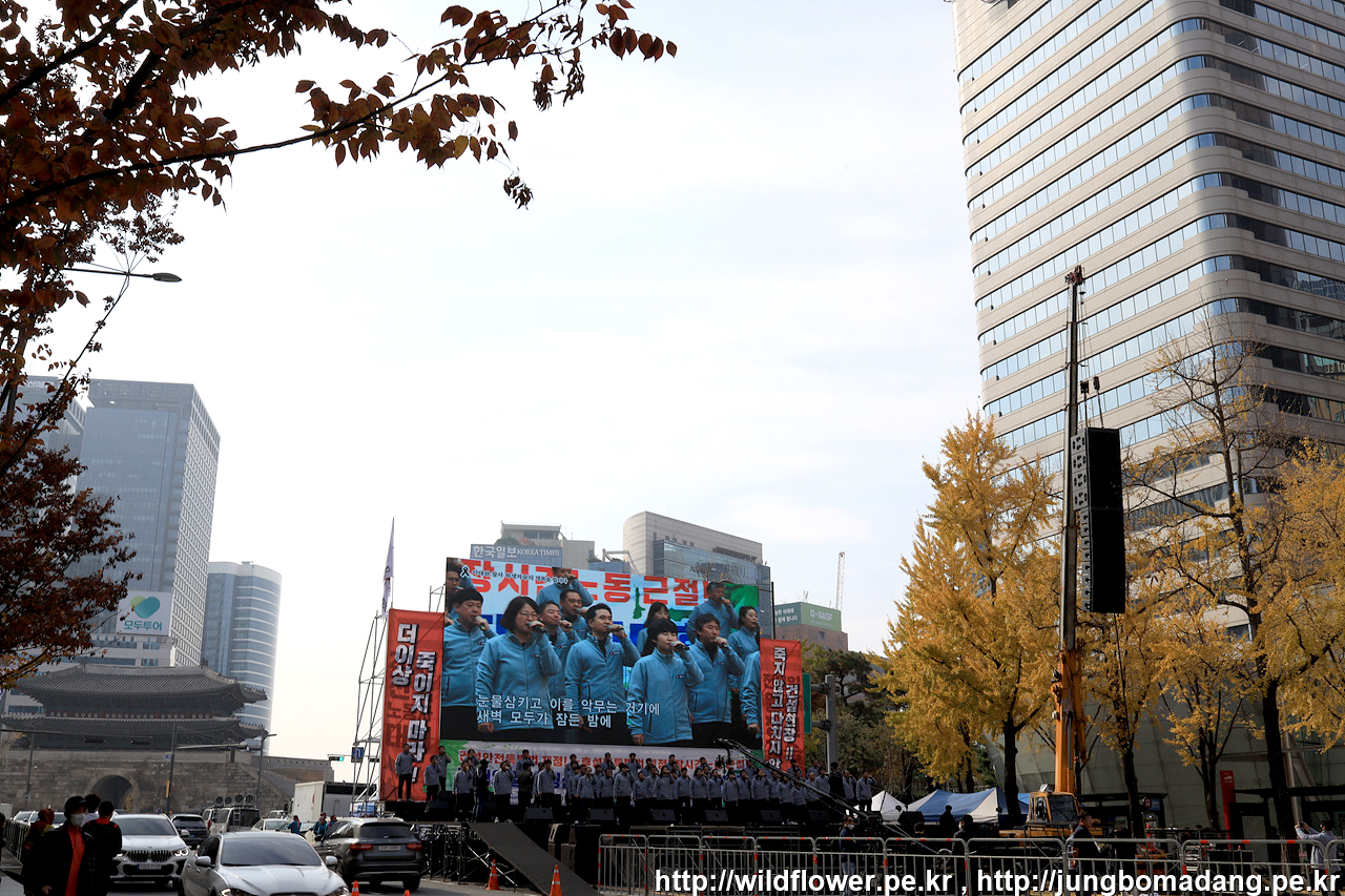 버스를 타고 이동하는 데, 광화문에 집회가 있는 지 많이 막혀서 하차하여 걷기로 합니다. 전국 노동조합 대회가 준비중이네요.