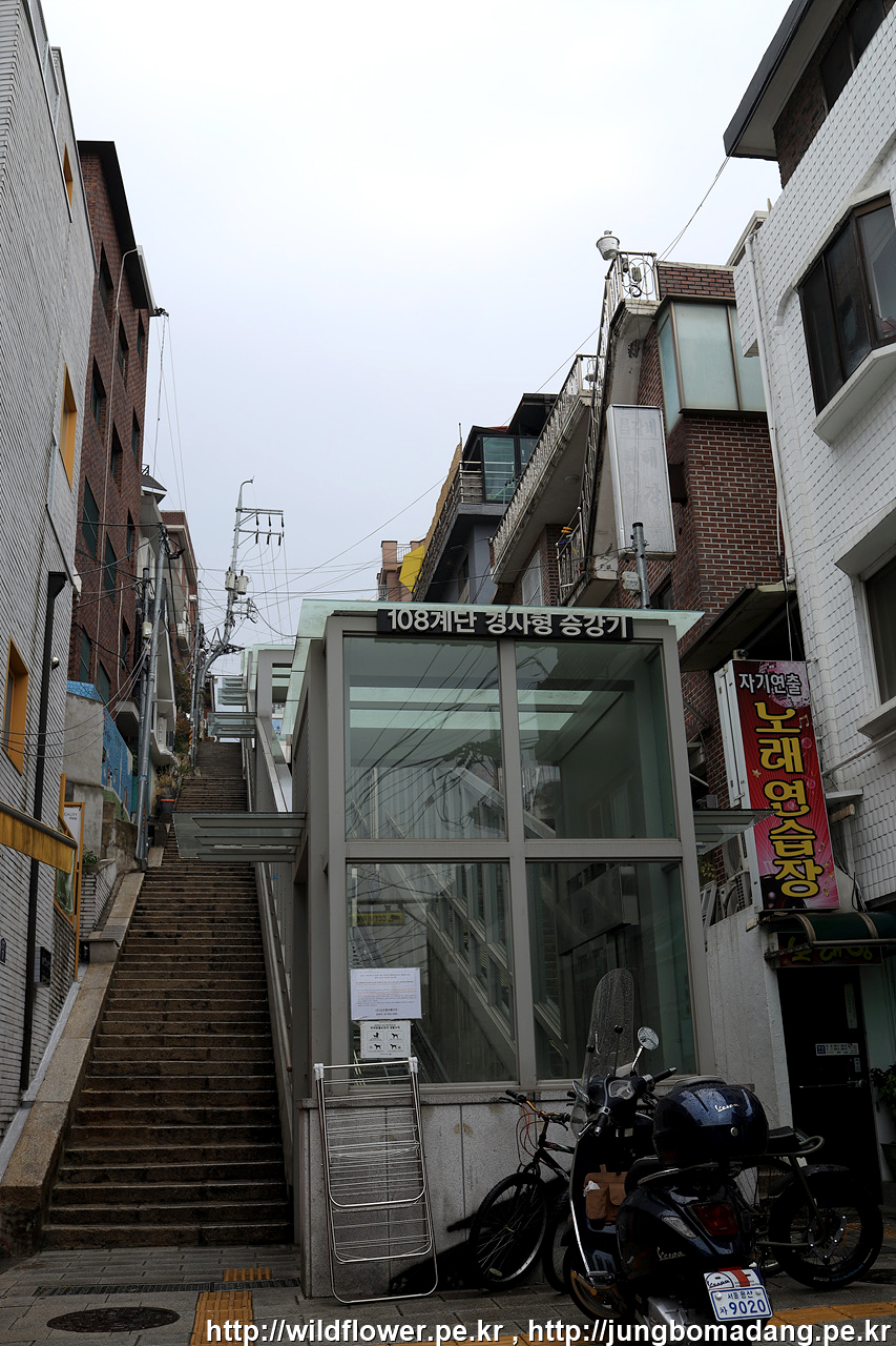 뭔가? 했는 데, 경사로에 승강기가 설치되어 있네요. 108 계단입니다. 승강기는 어르신들에게 양보하고 계단으로 살살 내려갑니다.
