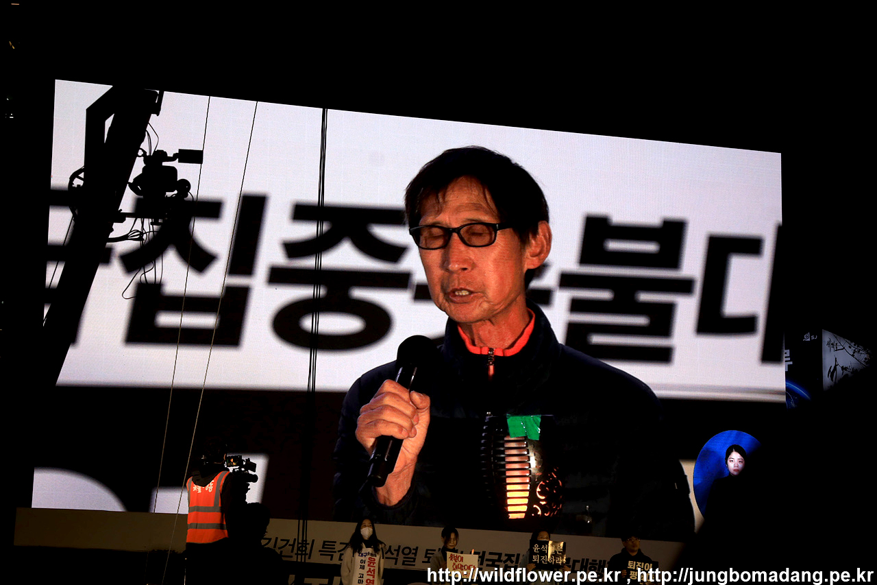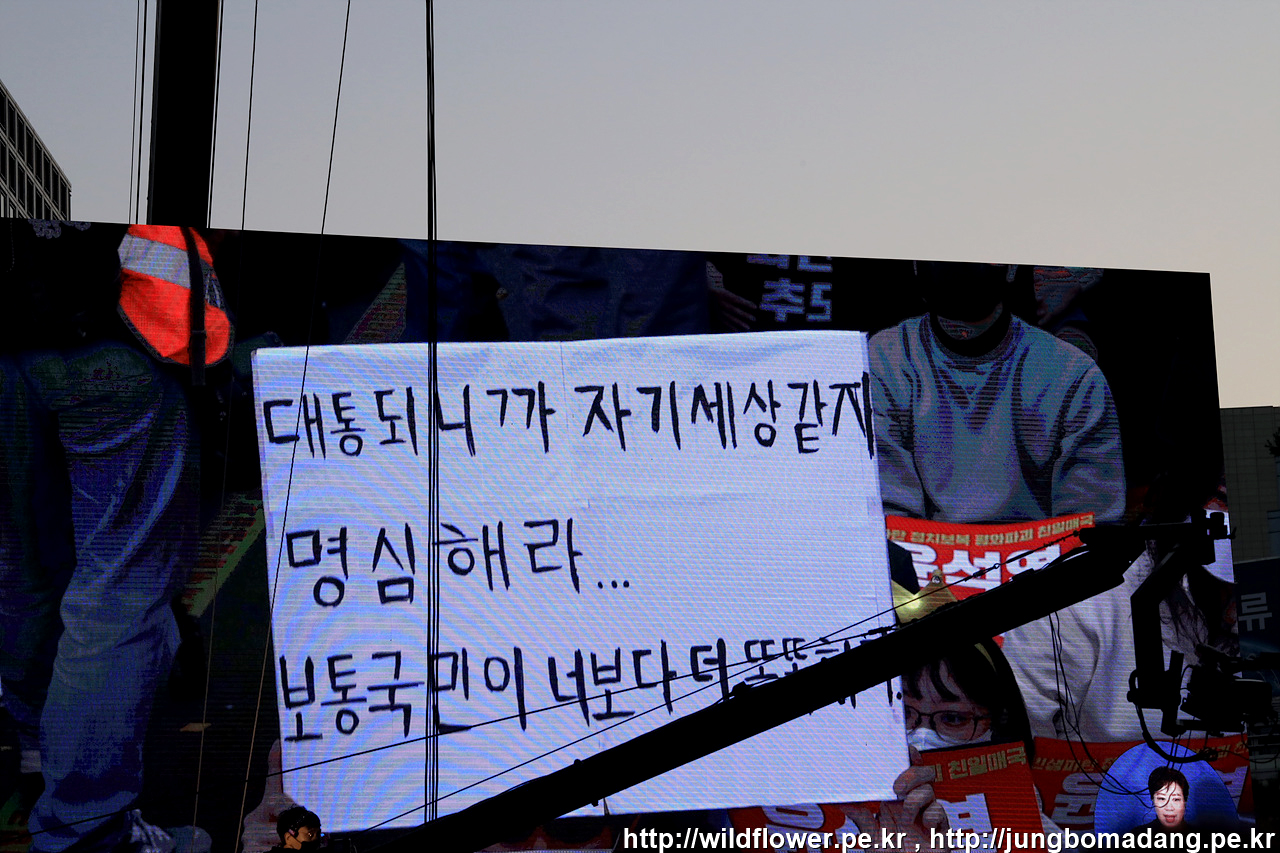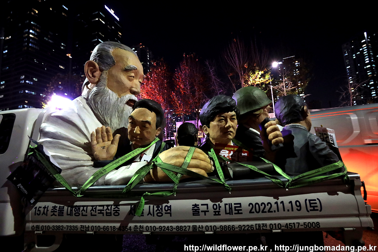 인터넷을 통해 자주 뵈었던 트럭도 보입니다. 정말 잘 만드셨습니다. 윤석열을 하도 시민들이 떄려서 망가져서 아예 윤석열 모가지가 돌아가게 만들었다는 말씀을 해주셨네요.
