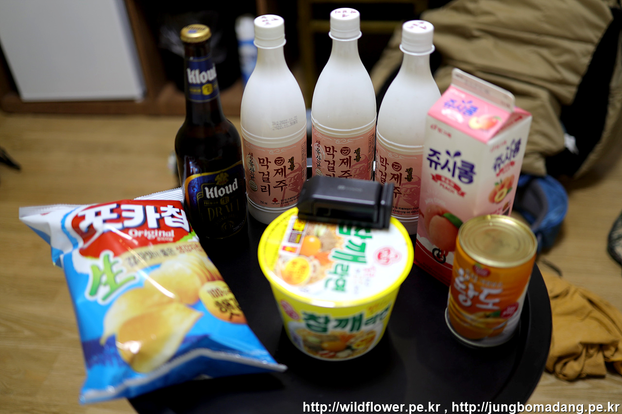 공항에서 15분 거리의 명주주택 정류장에서 202번 버스를 타고 모감동 정류장에서 하차하면 되는 데, 마트를 털어볼 요량으로 주변에서 방황하다 보니 전에 이용했던 마트가 망해서 어쩔수 없이 편의점에서 막걸리만 보충합니다.
