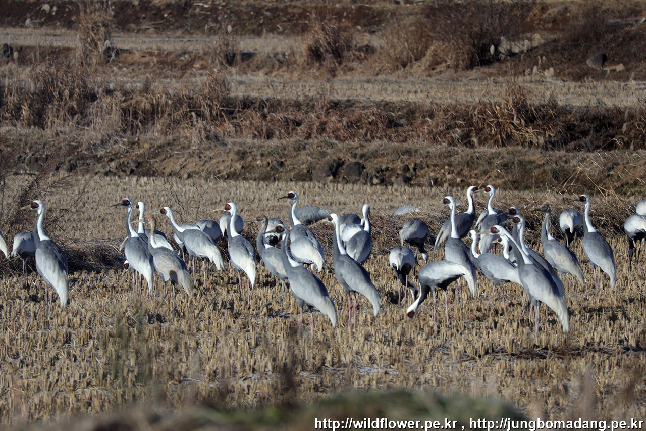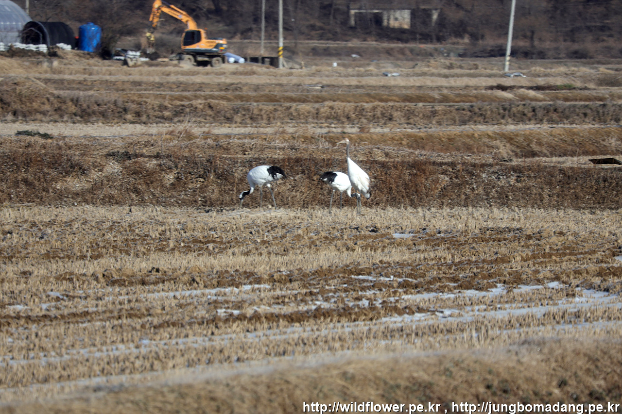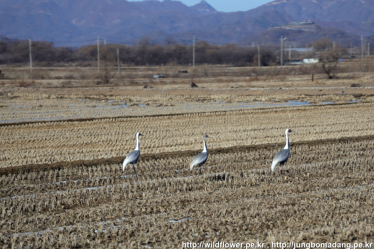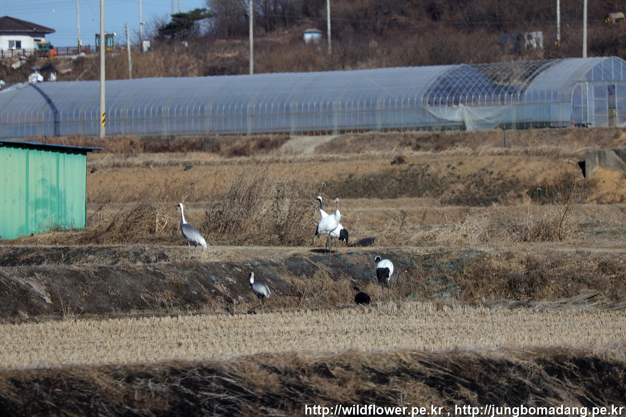 두루미(단정학) 가족 - 두루미는 새끼때 머리가 황색입니다. 두루미는 부부가 1~2마리 새끼를 낳기 때문에 두루미 가족은 새끼 포함 3~4마리입니다.