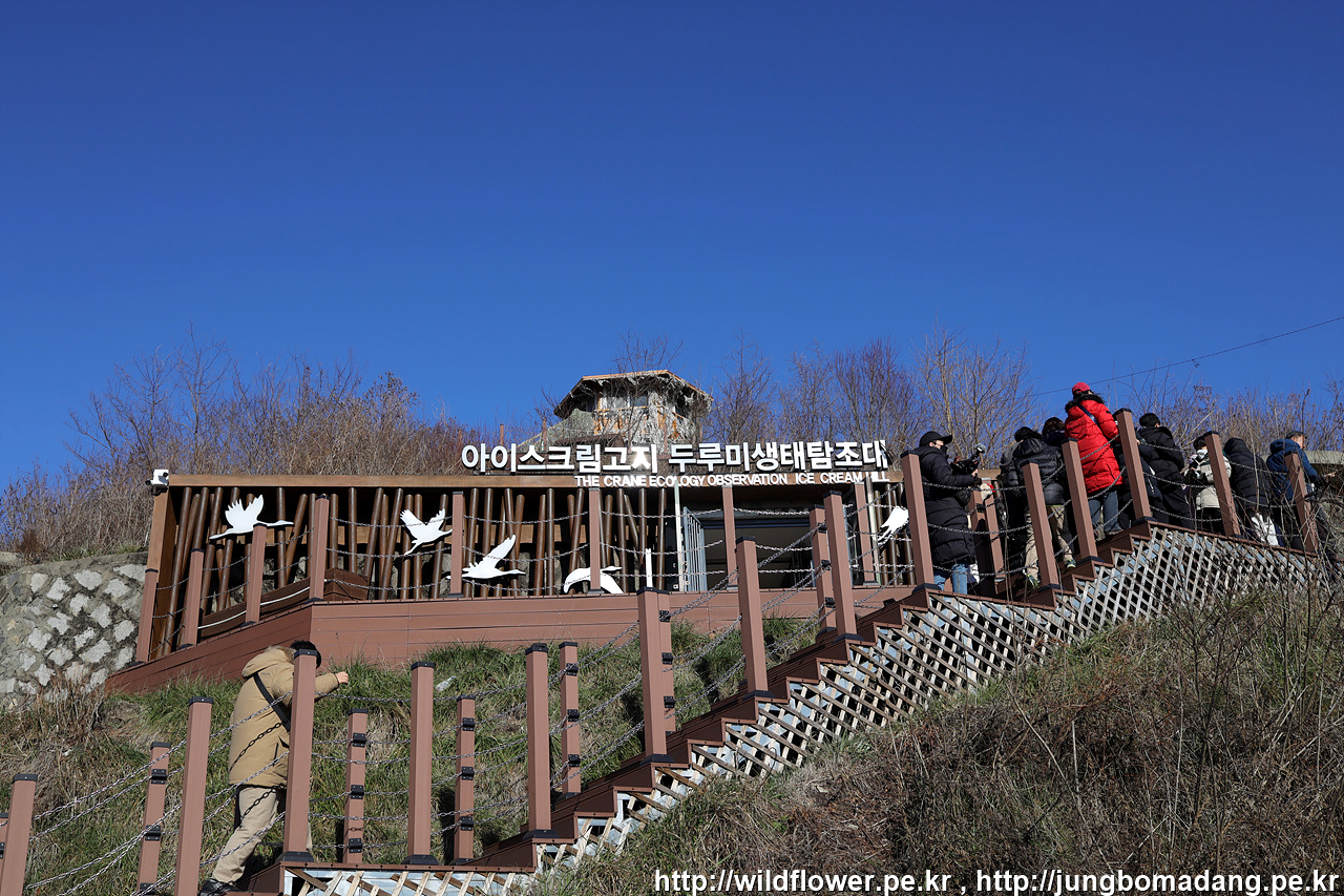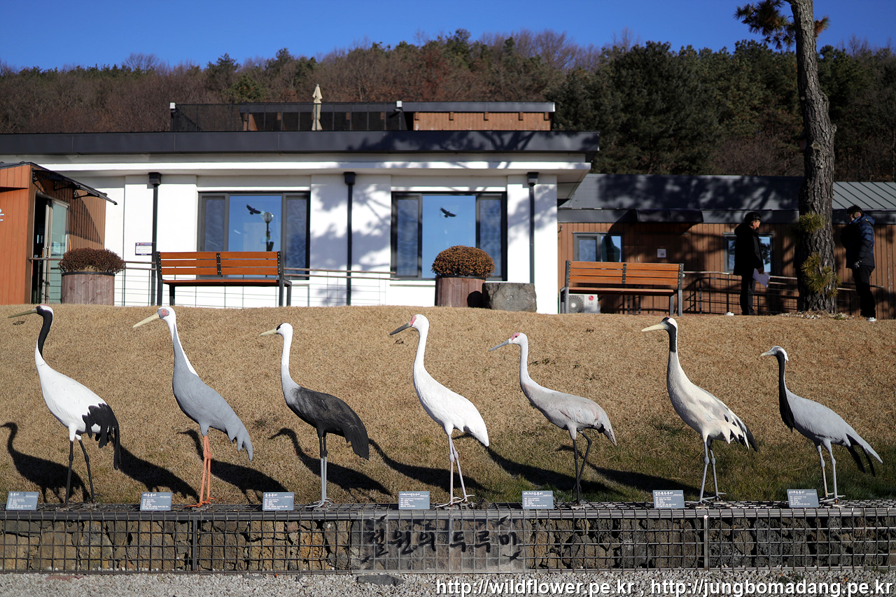 두루미 모양 조형물인데 고개를 무한 까딱이는 데, 왜? 부리를 테이프로 묶어 두었나 궁금했는 데, 나중에 투어시 해설사님이 설명해 주시는 데, 두루미는 사람을 만나면 부리로 쫀다고 합니다. 근데 만날일은 거의 없는 것이 예민한 녀석들이라 이미 수백미터 전부터 인기척이 느껴지면 날아가 버리기 때문입니다.
