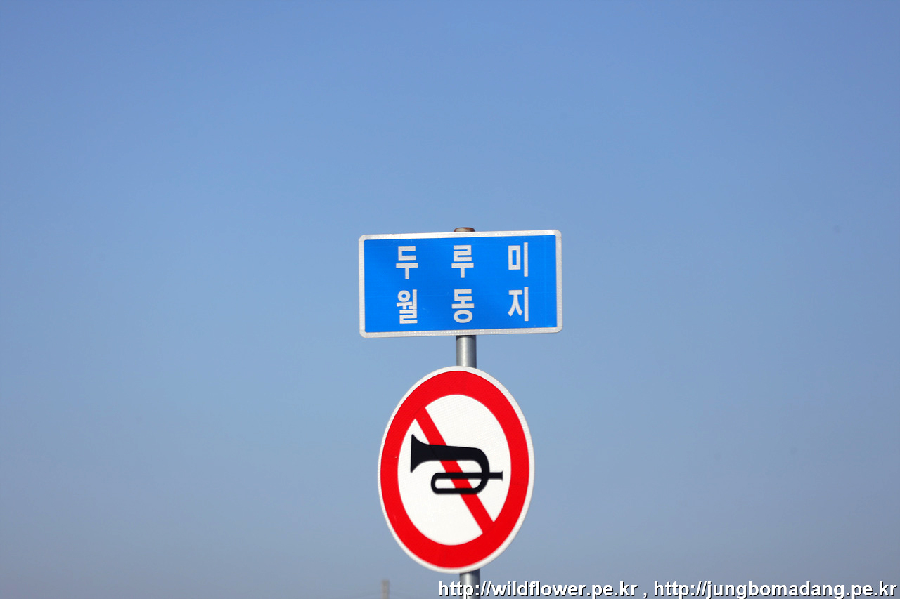민통선초소를 지나고 이동간에 두루미 월동지라는 안내판이 눈에 띄네요. 아래 표시는 차량 경적 금지!