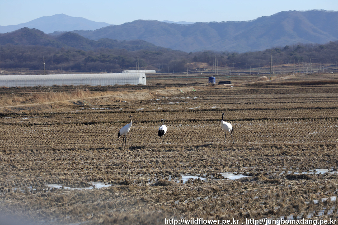 두루미(단정학) 가족 - 두루미는 새끼때 머리가 황색입니다. 두루미는 부부가 1~2마리 새끼를 낳기 때문에 두루미 가족은 새끼 포함 3~4마리입니다.