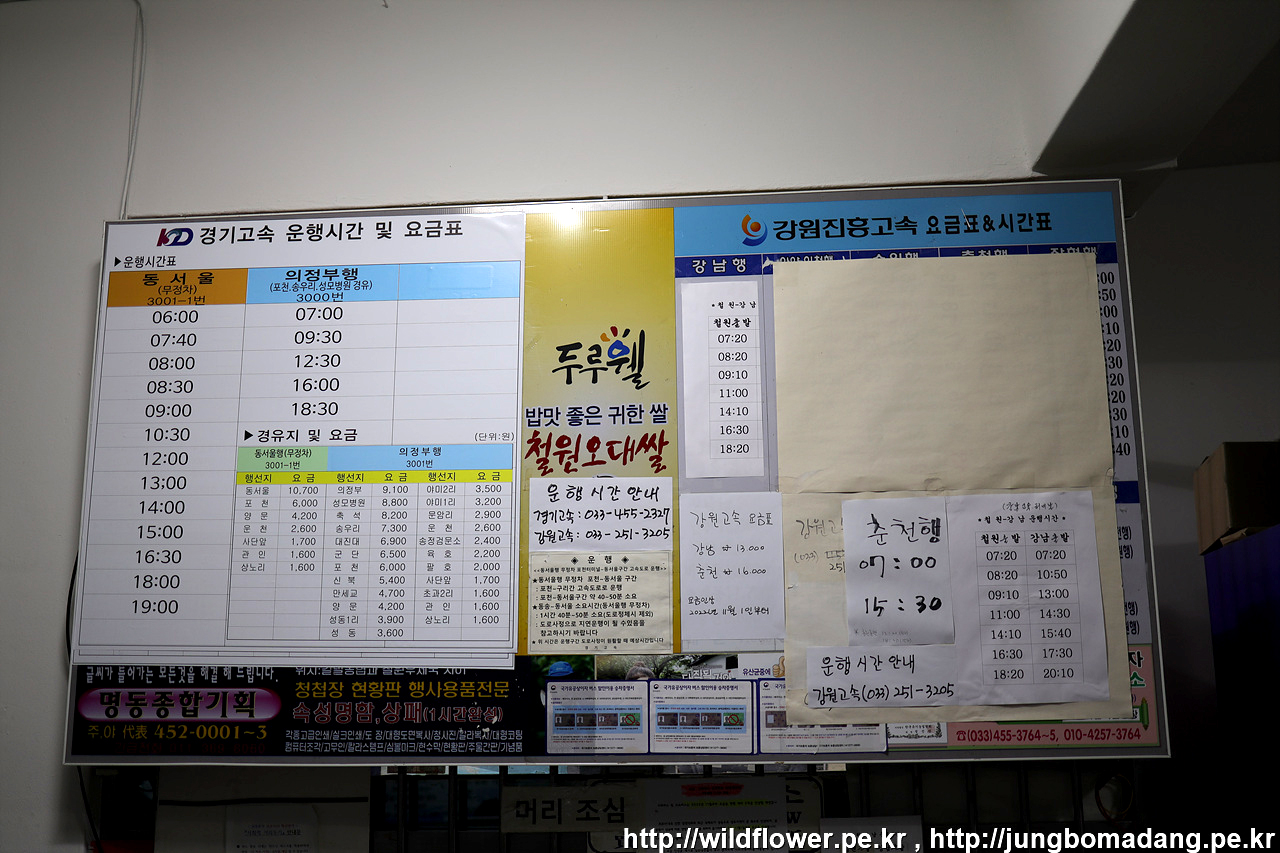 현 시간 7시 30분. 동송 시외버스터미널 한장 담고서, 되돌아갈 것을 참고해서 길 건너편 터미널 내에 시외버스 시간표 한장 담아 봅니다.