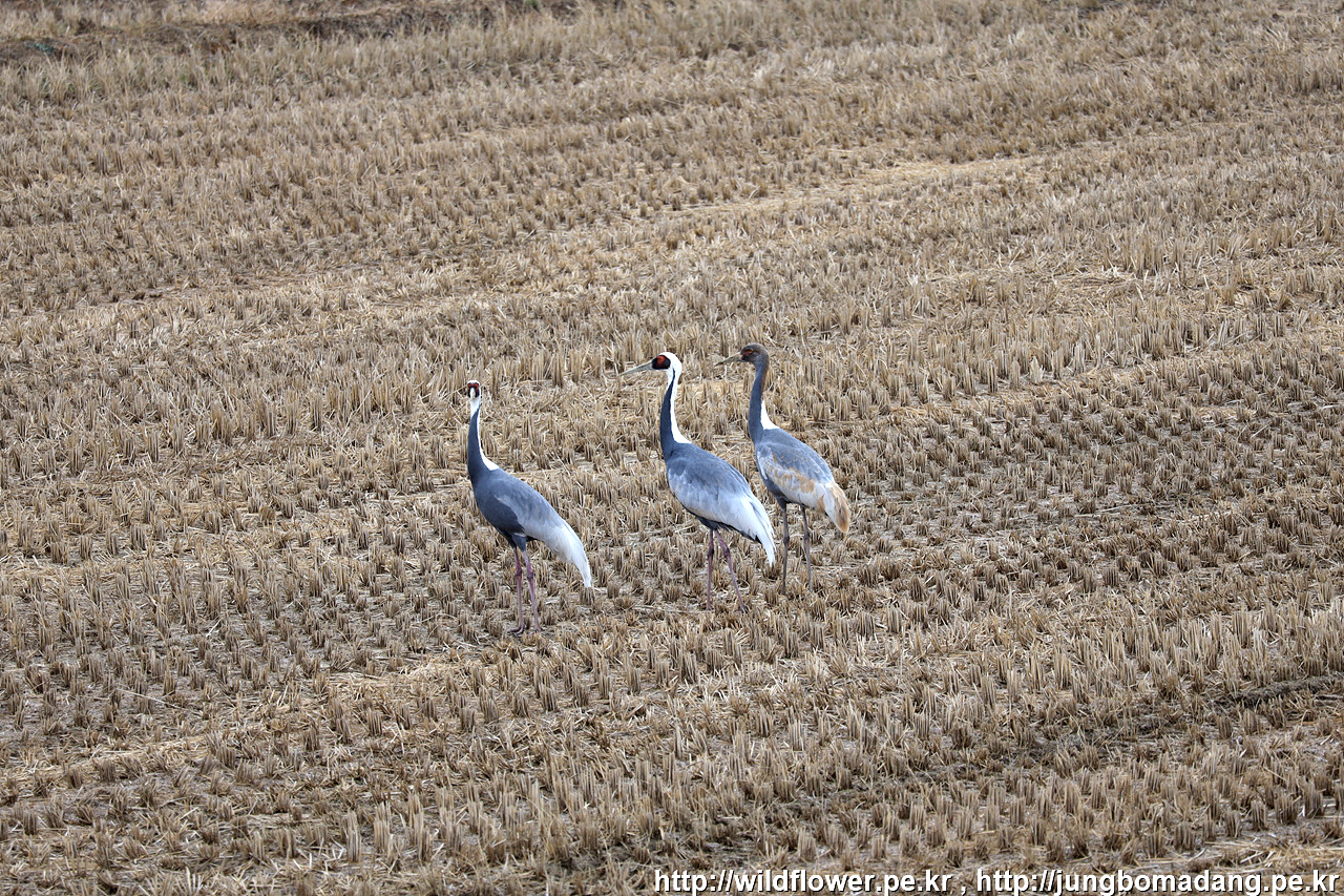 재두루미 가족 (성조, 어린새, 성조) - 이와 같이 앞으로 고개를 숙인다면 곧 날아 오를 거라고 보시면 됩니다.