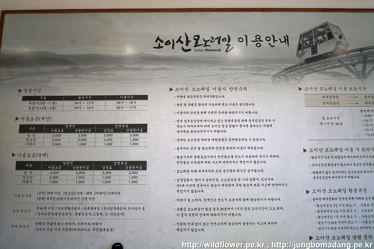 소이산 모노레일 모습입니다. 총 4대(파랑, 노랑, 적색, 녹색)가 운영 중이며 아주 천천히 이동합니다. 아래편에 입장료와 운행 시간 안내합니다.