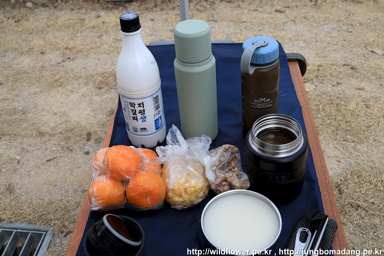 점심 시간이 되어 편의점에서 막걸리 한병 사서 집에서 챙겨온 어묵탕 등과 함께 끼니를 해결합니다.