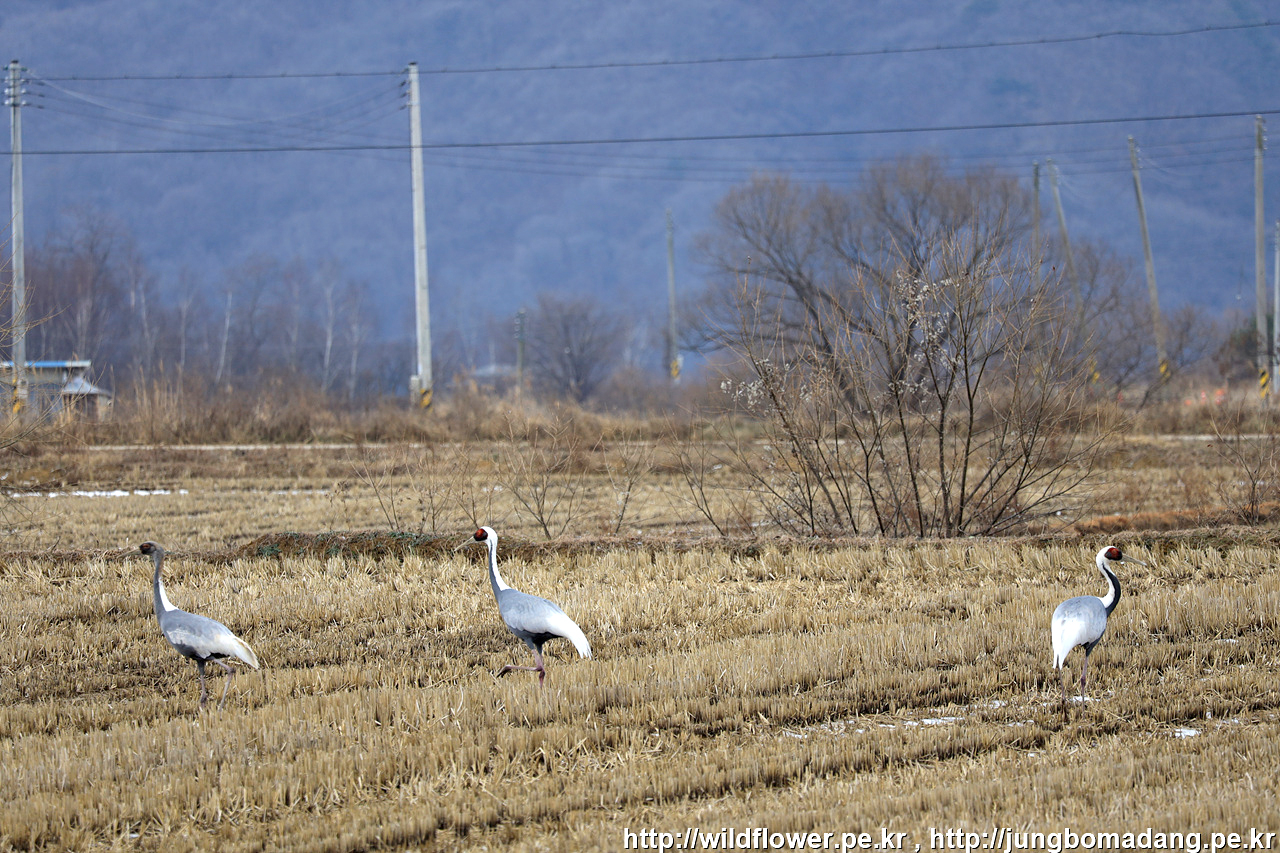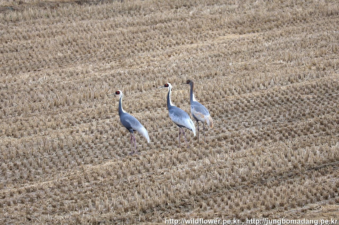 재두루미 가족 (성조, 어린새, 성조) - 이와 같이 앞으로 고개를 숙인다면 곧 날아 오를 거라고 보시면 됩니다.