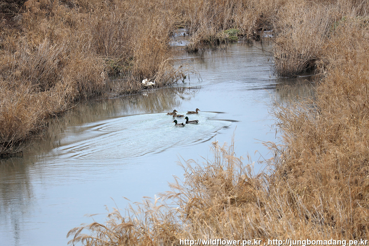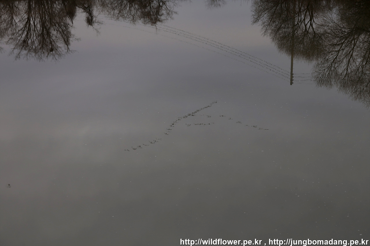 하천 물 위로 쇠기러기들이 바삐 움직이는 반영