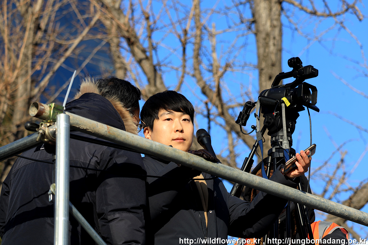 곧바로 행진이 있을 예정이고, 본집회는 시청이라 행진 차량에서 촛불행동 권오혁 사무국장님이 안내를 하고 있습니다.