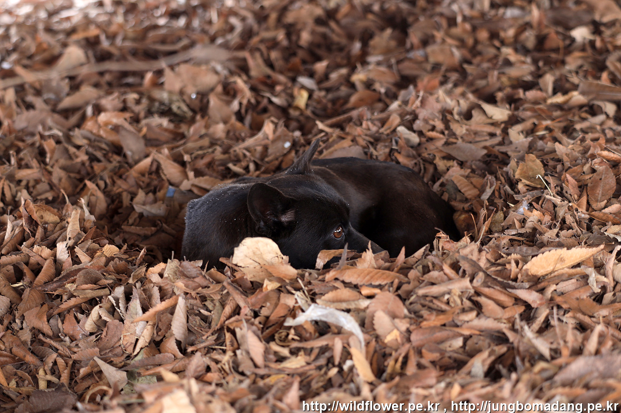 털이 없어 그런지 오돌 오돌 떠는 모습이 안쓰러워 주변의 낙엽을 모야서 막아 봅니다.