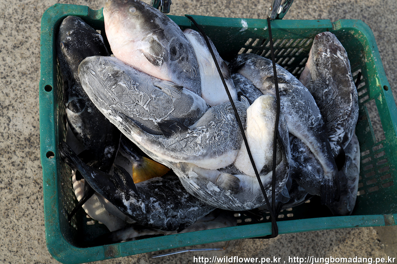 다먹고 일어나려는 데, 냉동된 개복치들을 해동하기 위해 바닷물에 담그는 것을 봤습니다.