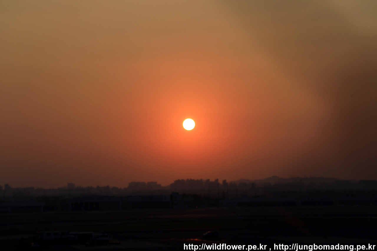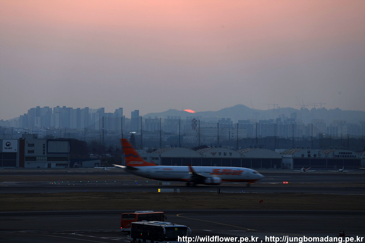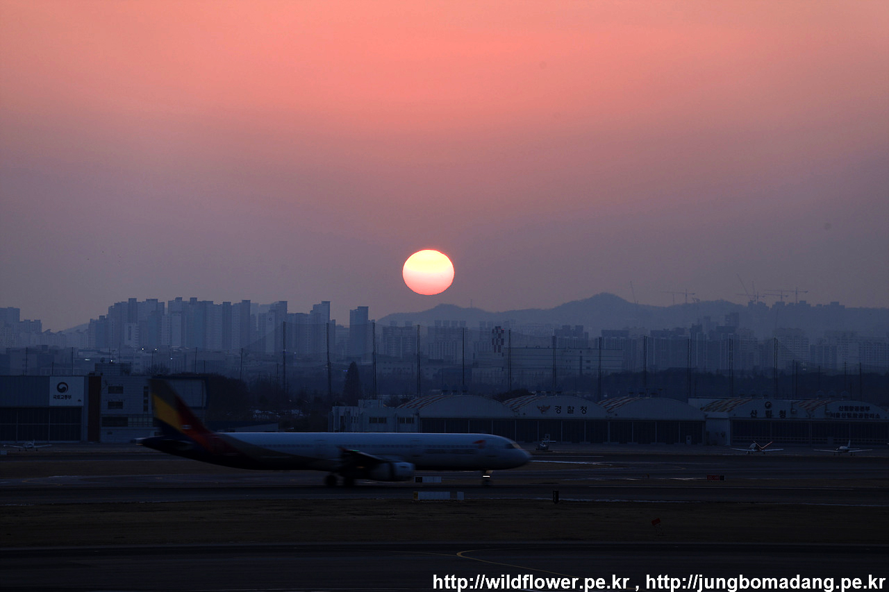 일몰 - 해가 능선에 걸려 넘어갈때까지 아시아나, 아시아나, 제주항공 세대의 비행기가 이륙을 합니다.