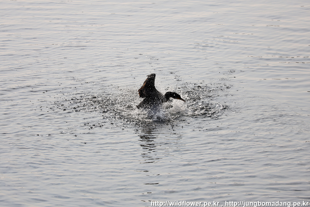 가마우지 한마리가 목욕을 하는 지 계속 주기적으로 날개짓을 합니다.