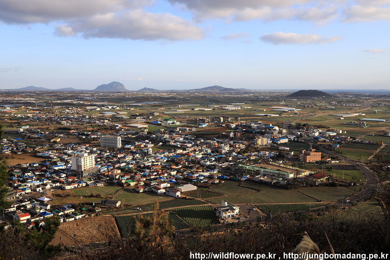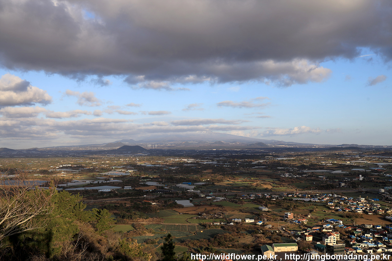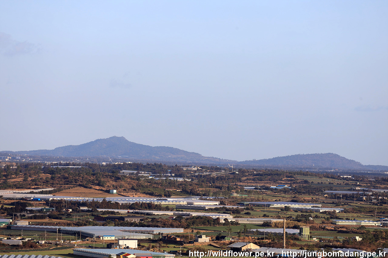 당산봉 정상 풍경 - 사진은 평화롭지만 바람이 어마 어마 무시하게 불고 있습니다. 좌측으로 한라산 우측으로 산방산이 보입니다.