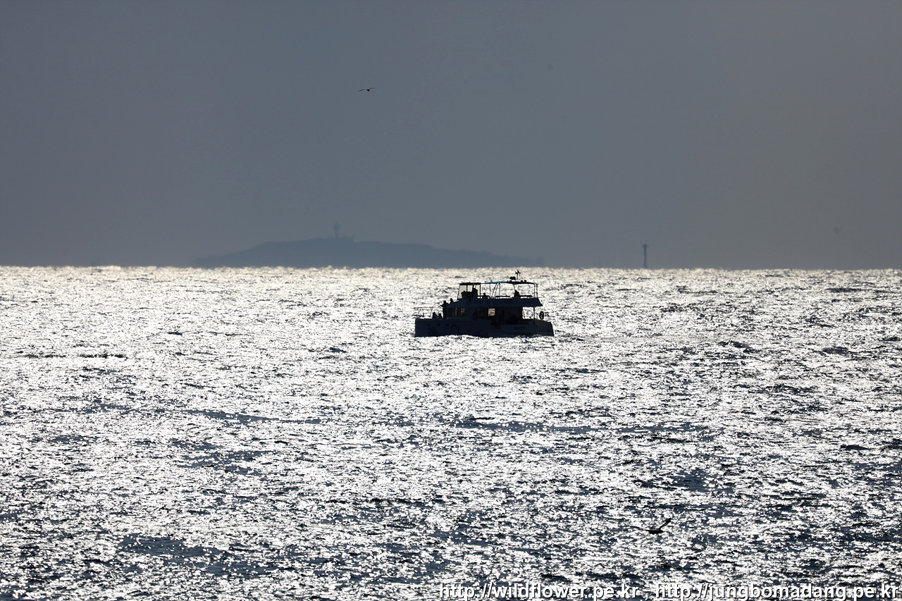 한치 잡이 어선도 망원으로 당겨 봅니다. 날이 밝았는 데 집어등이 켜있네요.