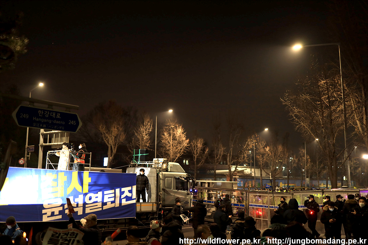삼각지역에 다가오니 더이상 접근을 막는 차벽이 설치되어 있습니다. 이태원 참사 희생자 추모 공간이 설치된 곳에서 극우 단체들의 방해 테러 행위로 인해 그들을 유인하기 위해 삼각지역까지 행진했다고 합니다.