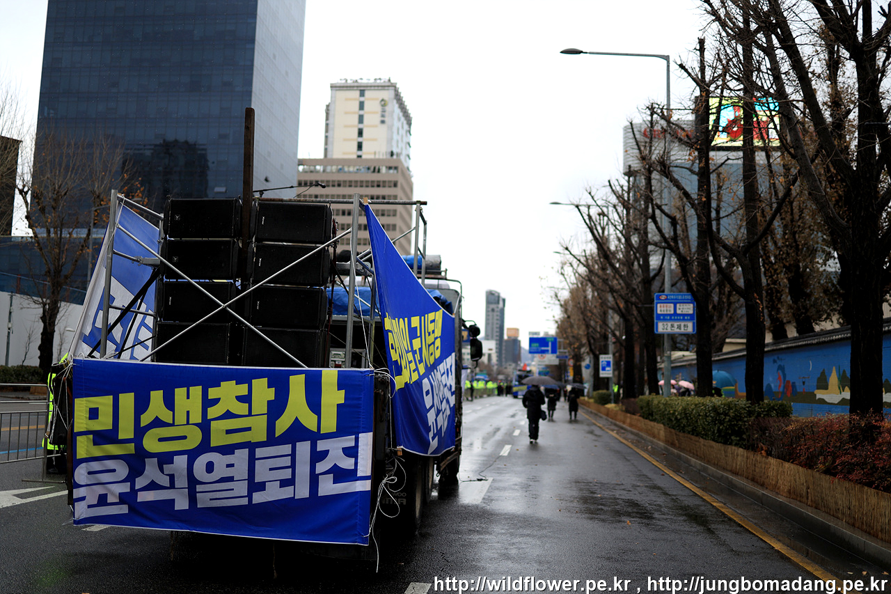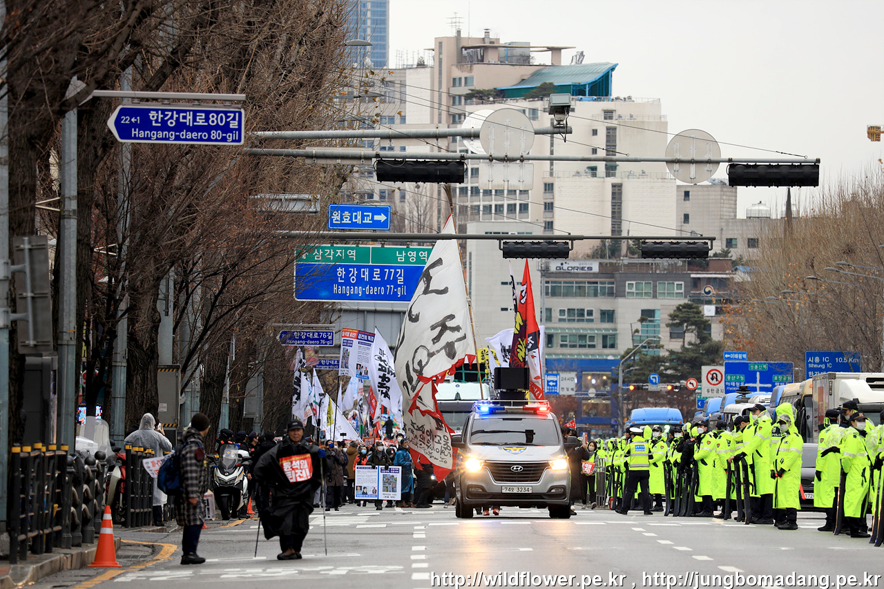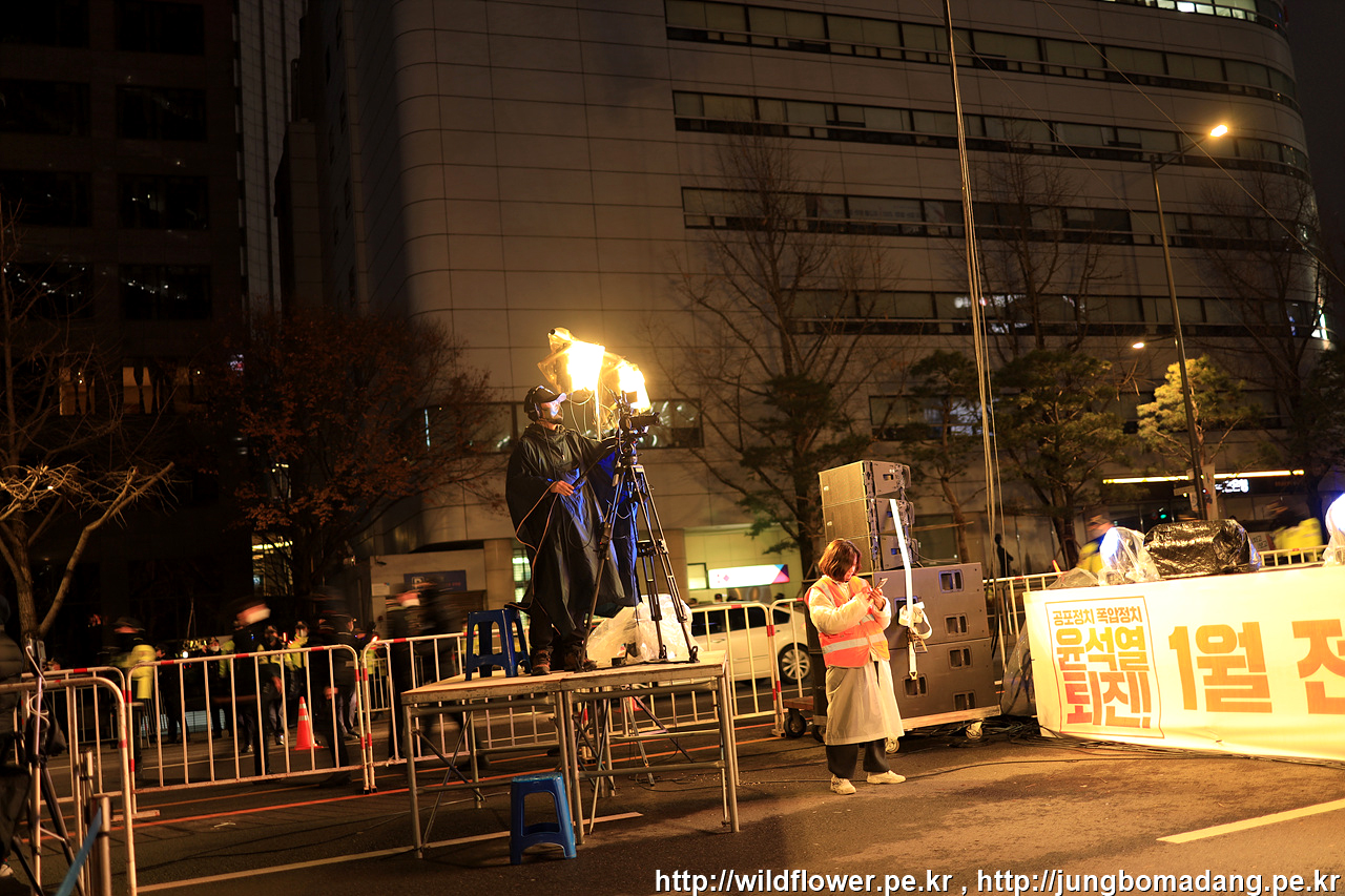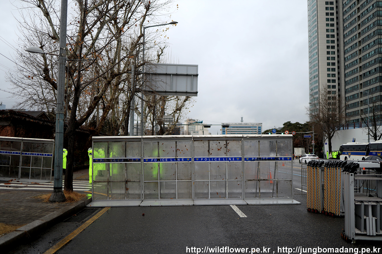삼각지역 11번 출구에서 약 300M 정도 되는 공간 2차로 정도 확보가 되어 있습니다. 극우들 시위대와 충돌을 방지하기 위해 차단벽이 삼중으로 설치되어 있습니다.