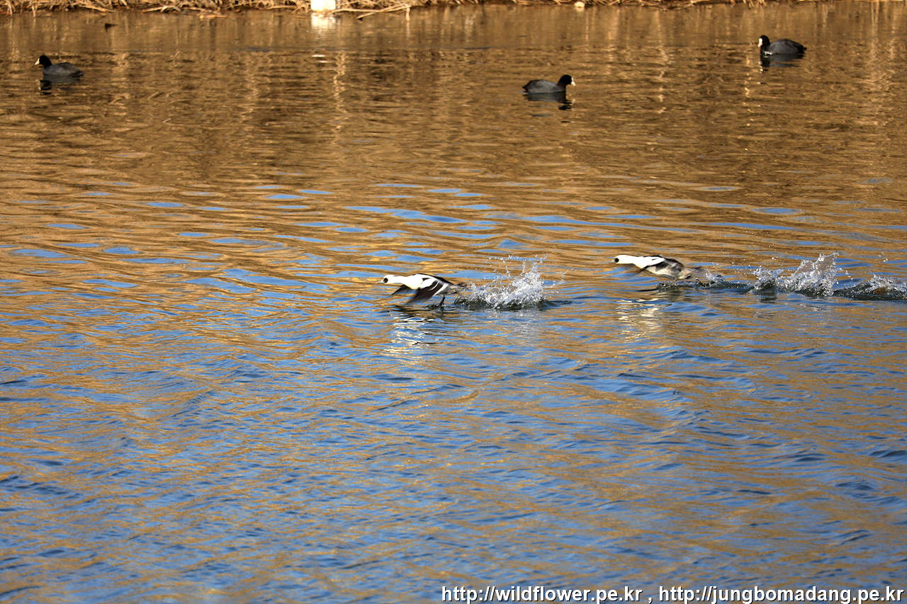 흰비오리 수컷(중 2마리) 비상, 물닭(상 3마리)