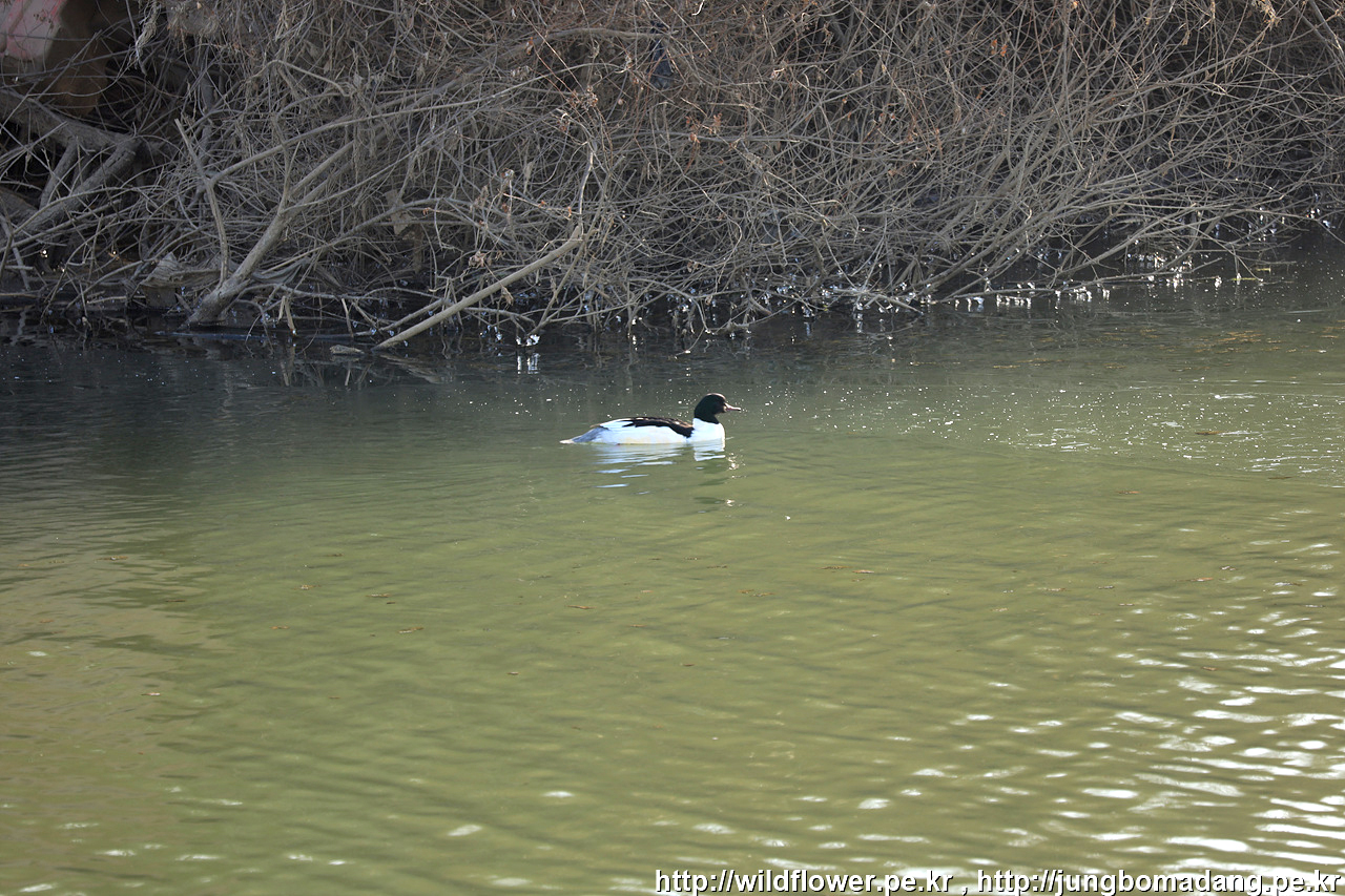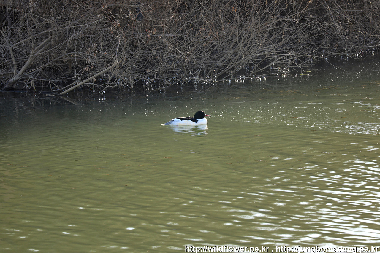 비오리 - 수컷. 오리계의 판다로 불리는 흰비오리 수컷과 달리 비오리는 머리 전체가 검은색이네요.