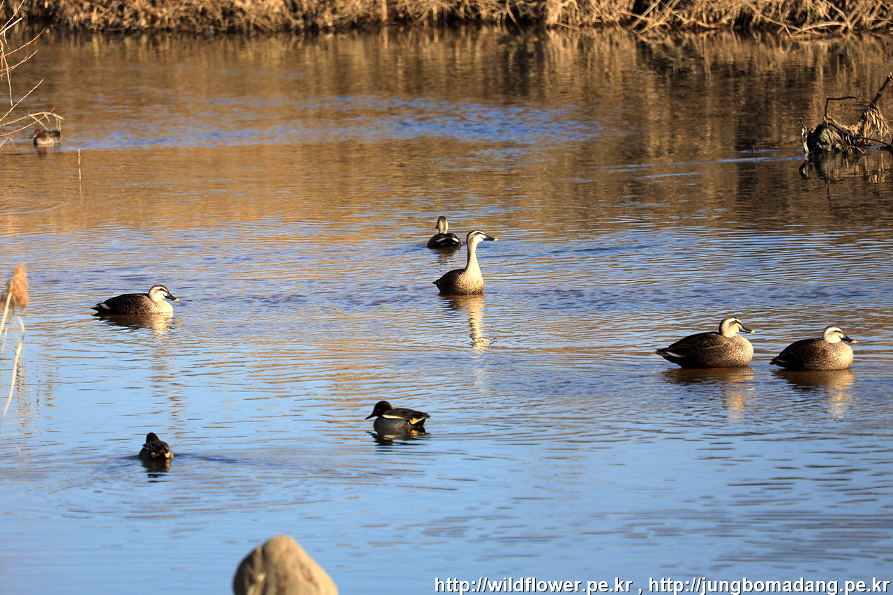 쇠오리(좌측 아래 작은 2마리), 흰뺨검둥오리(나머지)