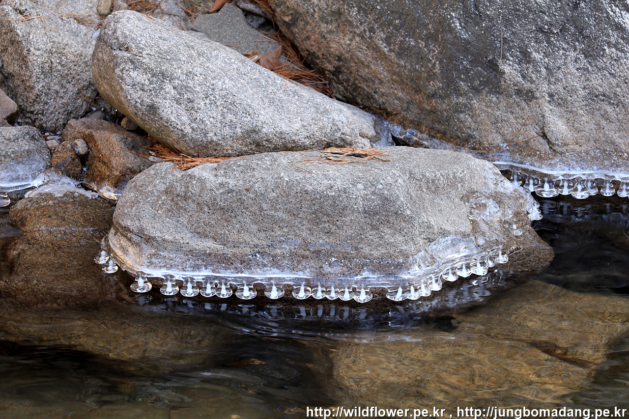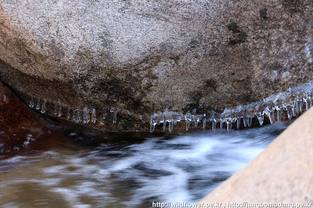 계곡 바위에 형성된 고드름의 형태가 마치 떨어지는 물방울 형태로 신기해서 망원으로 담아 봅니다.