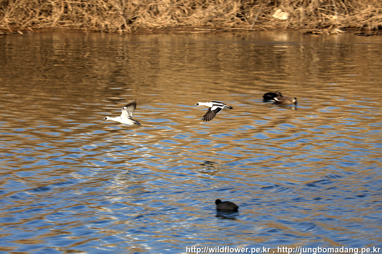 흰비오리 수컷(중 2마리) 비상, 물닭(상 3마리)