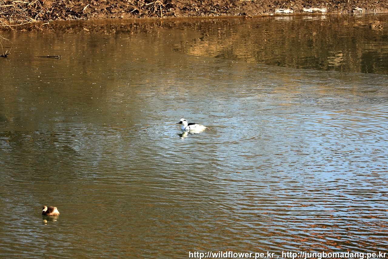 흰비오리 수컷(중), 논병아리(좌측 아래)