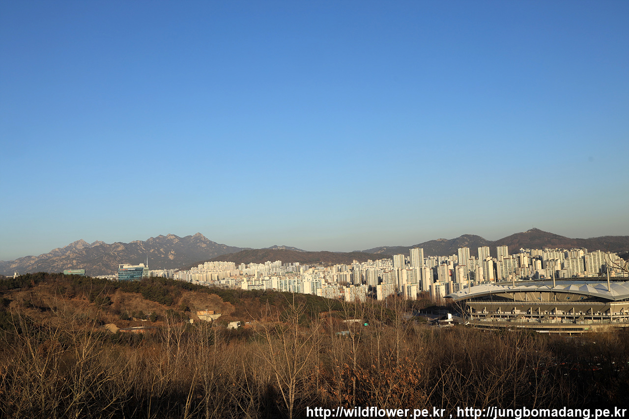 좌측에 북한산 그리고 그 아래로 문화비축기지, 우측 아래로 월드컵경기장.