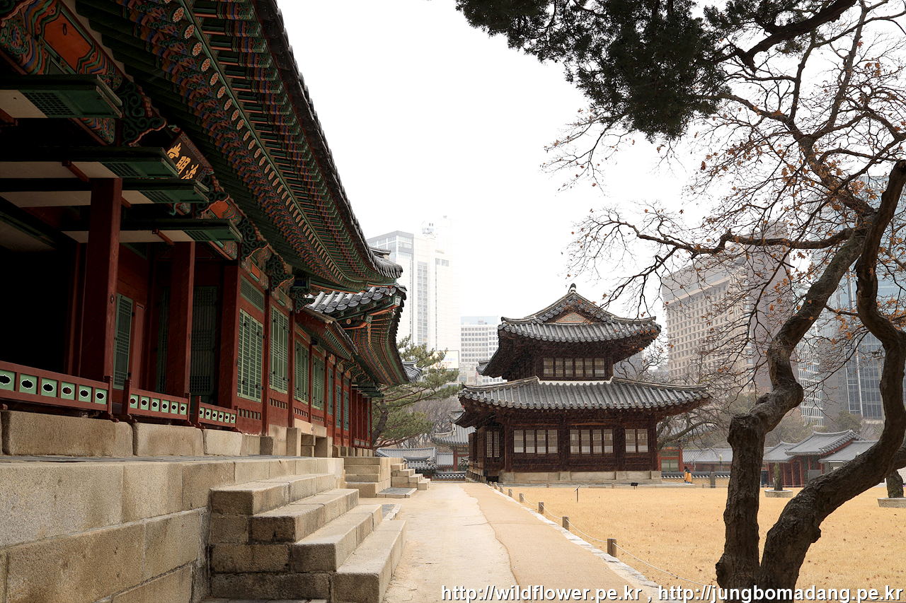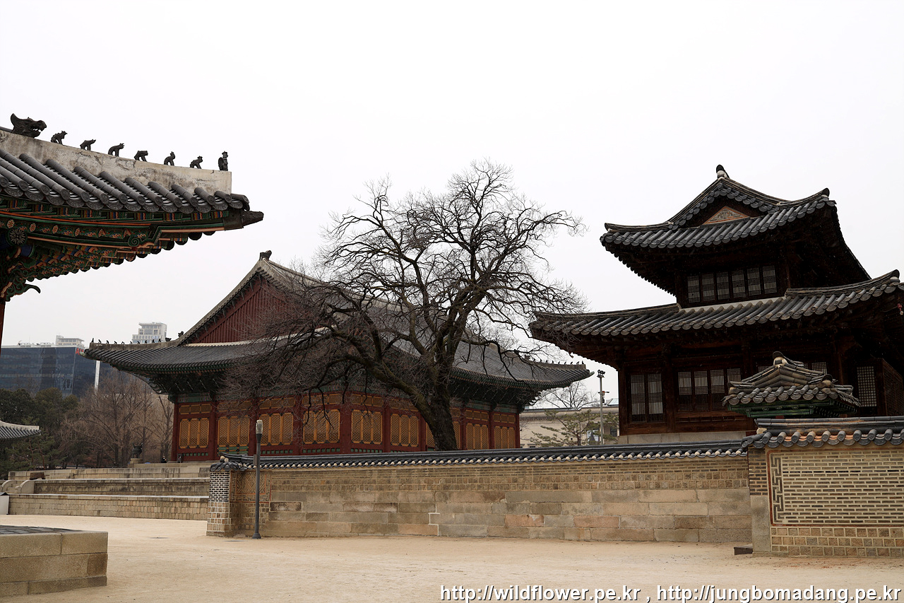 덕홍전(좌), 중화전(중), 살구나무(중), 석어당(우) - 석어당 앞에는 오래된 살구나무가 심어져 있습니다.
