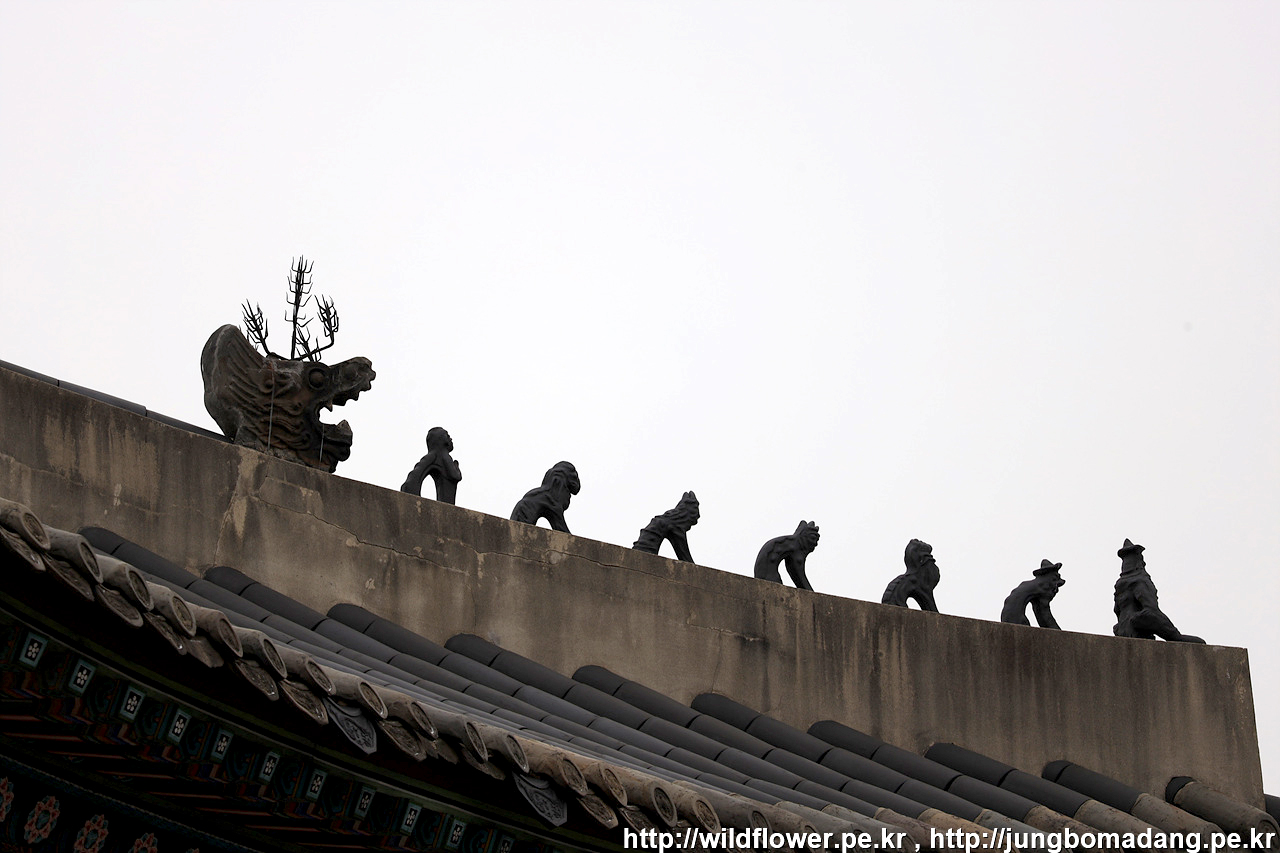 멀리서 기와 지붕 잡상의 용두 위에 식물이 자라나 하고 망원으로 떙겨 보니 아마 새가 앉지 못하게 설치해 둔 버드가드네요.
